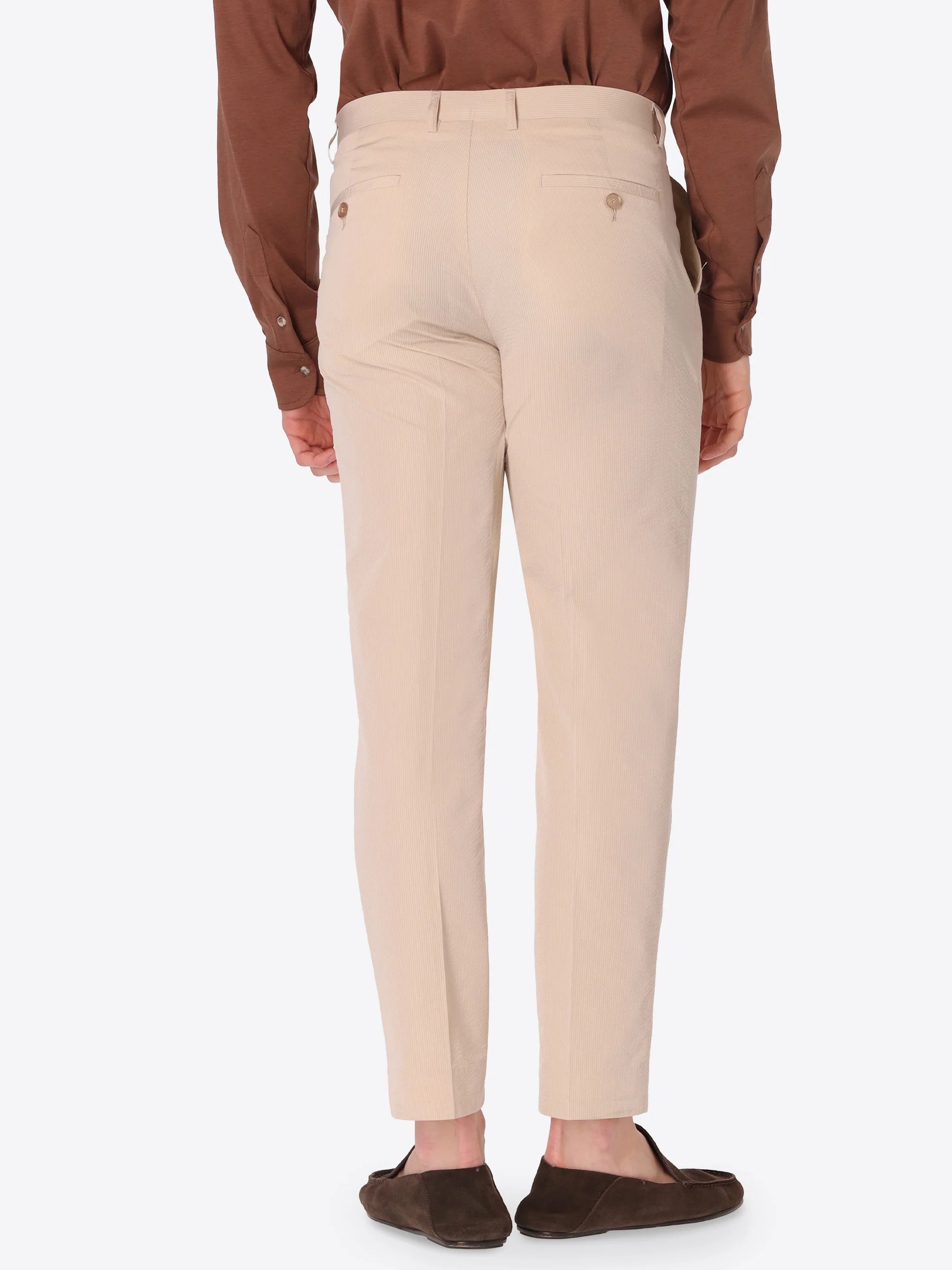 Carrot-fit trousers crafted in super-comfort embossed fine stripe fabric. Featuring front pleats, French front pockets and back welt pockets with button closure.