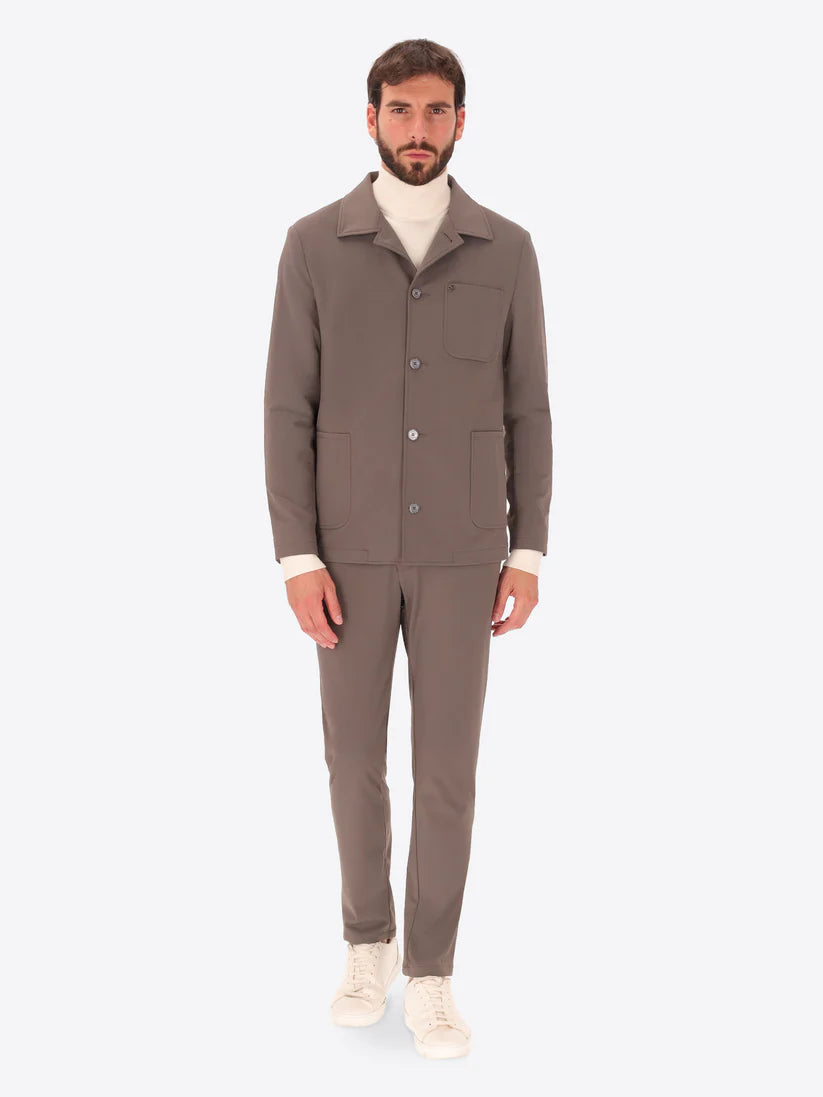 Shirt jacket made of “HP high perform” super stretch technical fabric, ensuring high performance in terms of elasticity and comfort. The garment features a central button fastening with buttonholes, front patch pockets, and a third patch pocket on the chest, a shirt collar, and shirt-style cuffs.