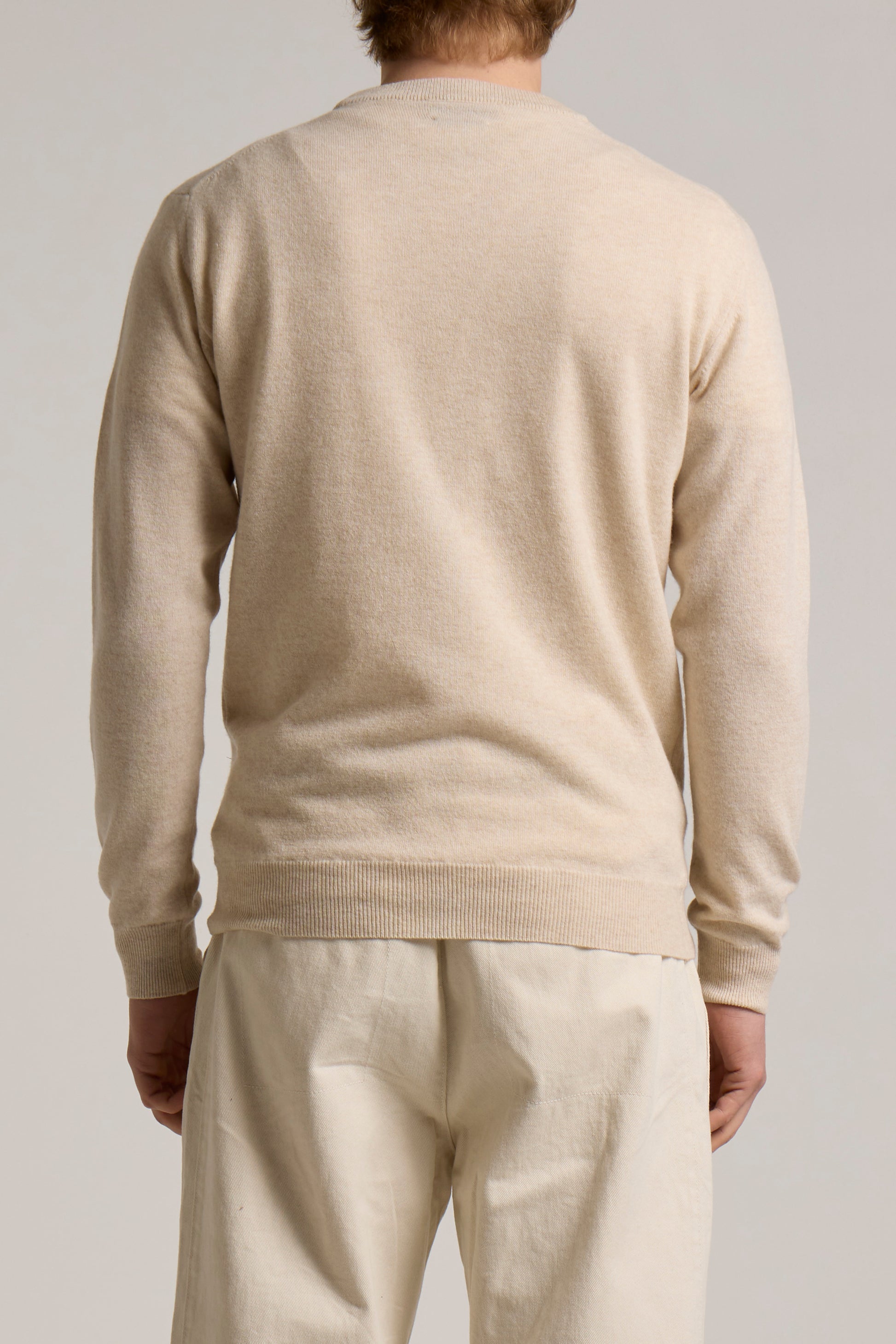 Cashmere and Extrafine Virgin Merinos blend yarn, single jersey crew neck sweater with 1 x 1 finishing.