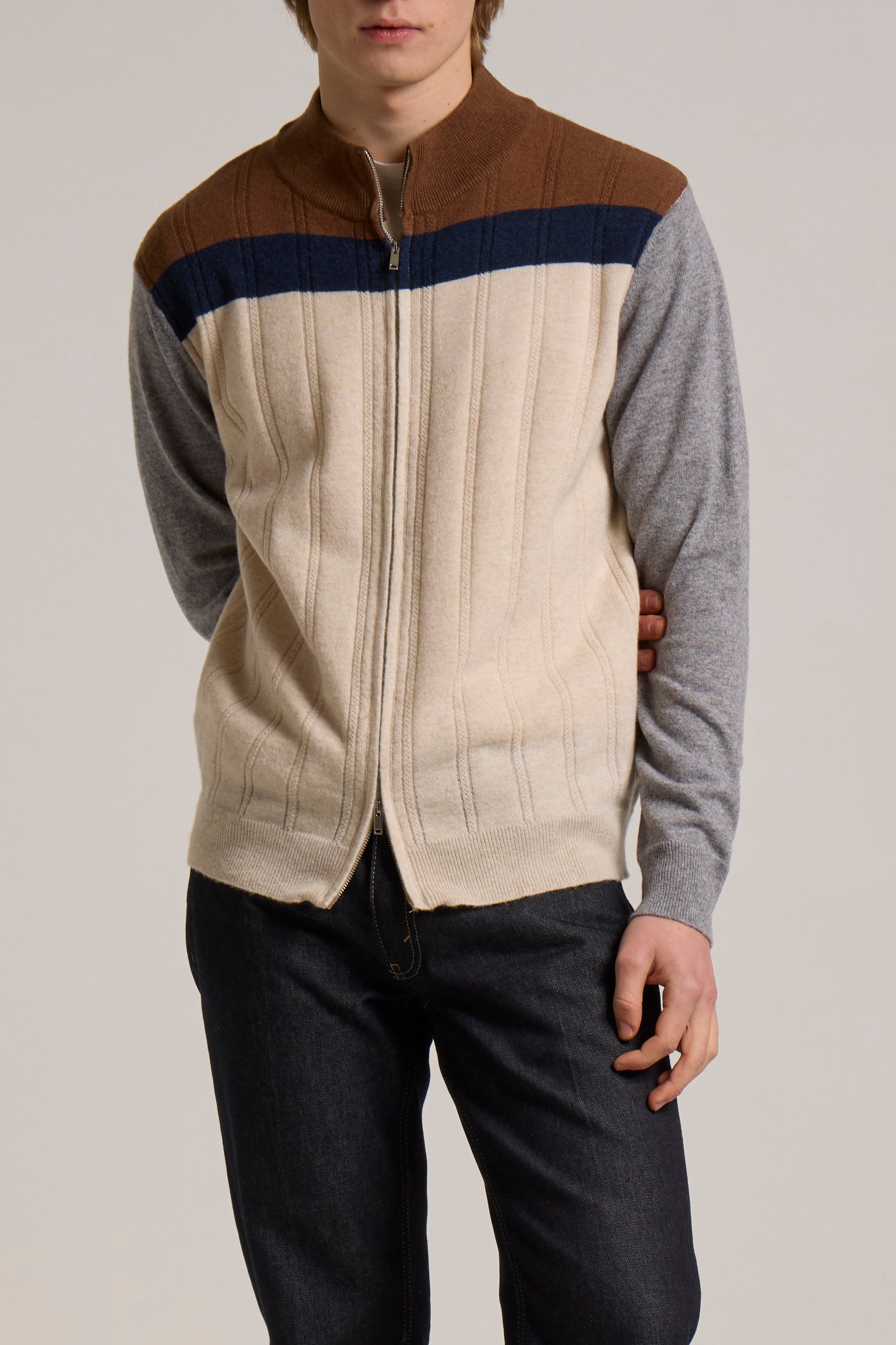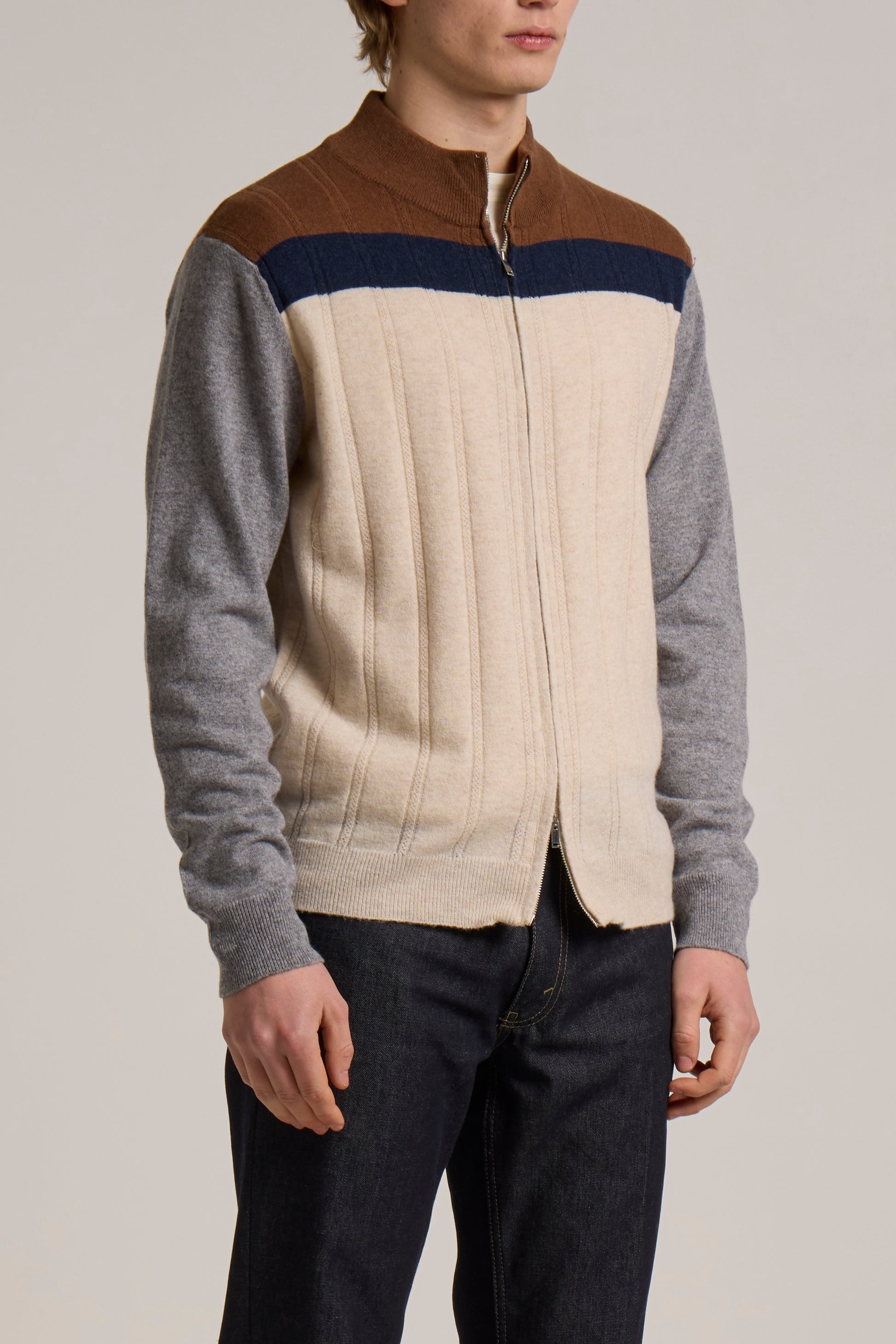 100% “Soft Shetland” Wool, colour block, full zipped half crew neck sweater with front and back wide rib stitched, single jersey sleeves and 1x1 finishing.