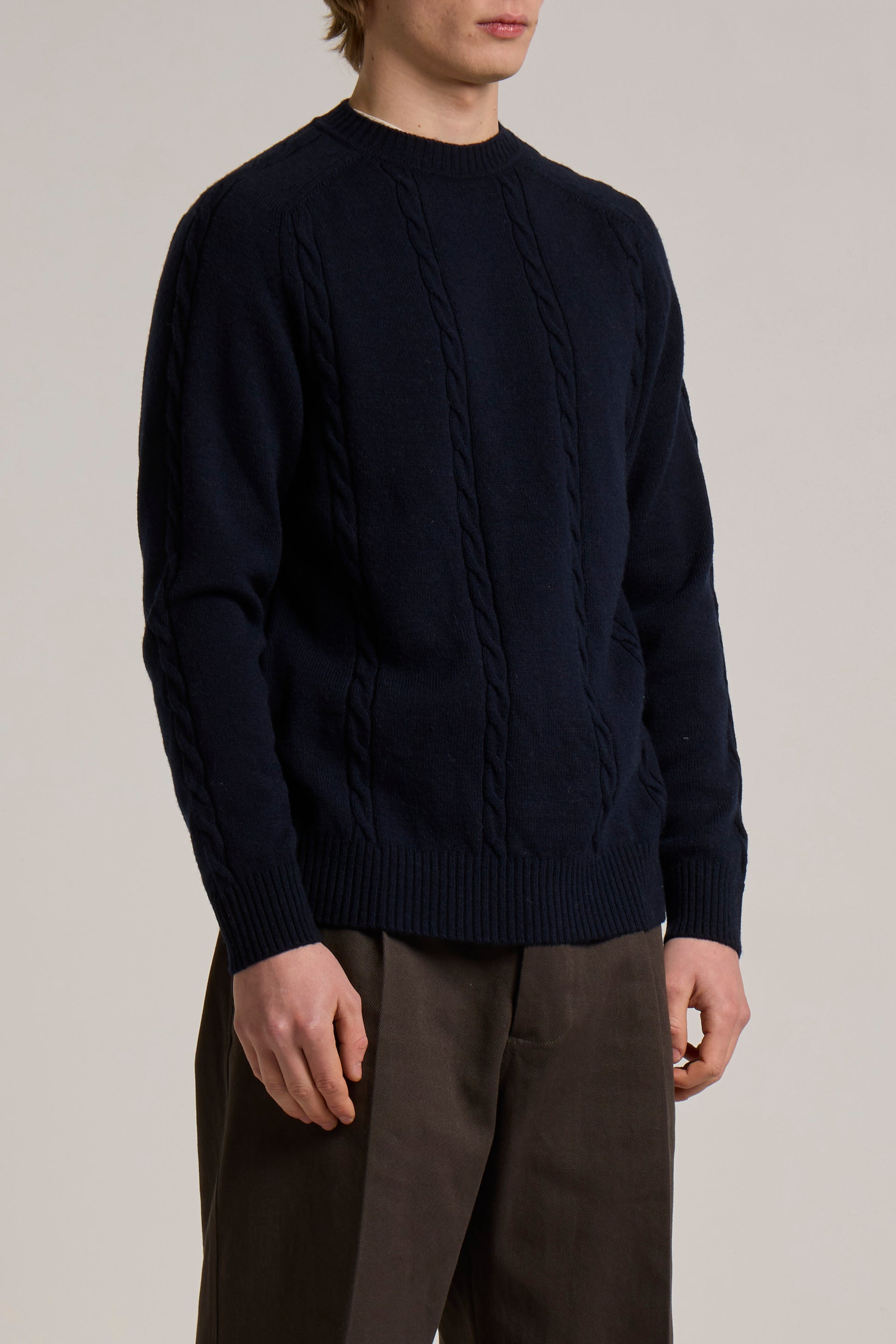 Extra twisted Merino's Wool,middle weight wide ribs and cables crew neck sweater with 2x1 finishing.