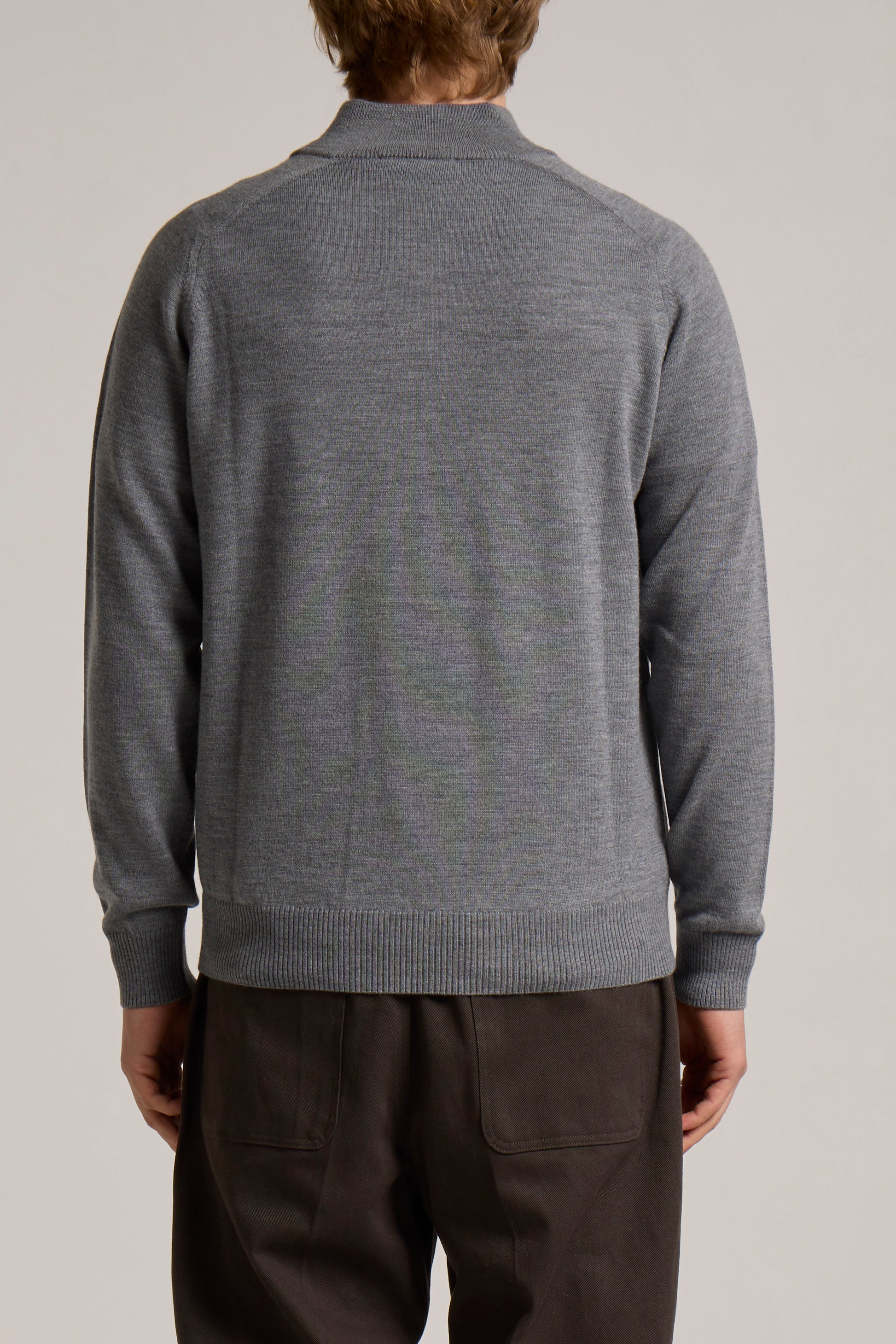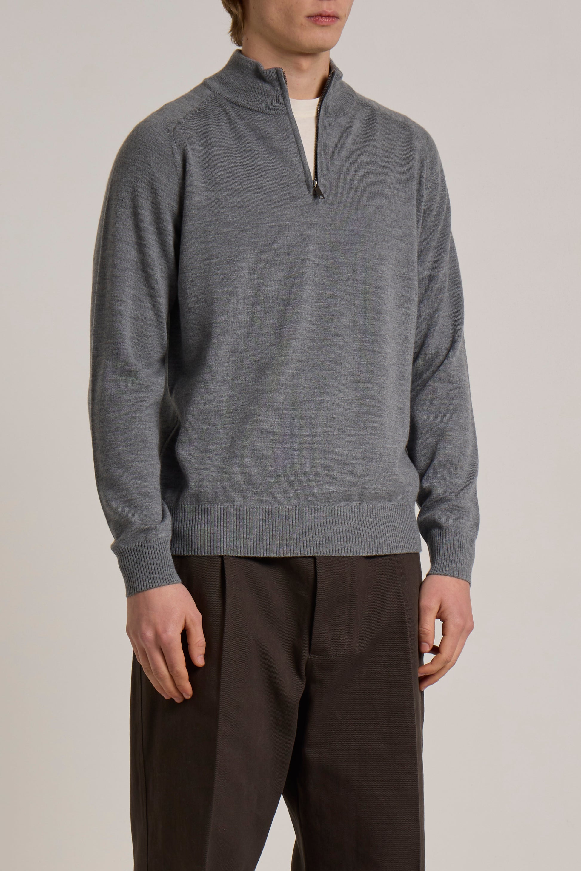 Extrafine Merinos Wool, single jersey saddle sleeves, zipped half neck sweater with 2x1 finishing.