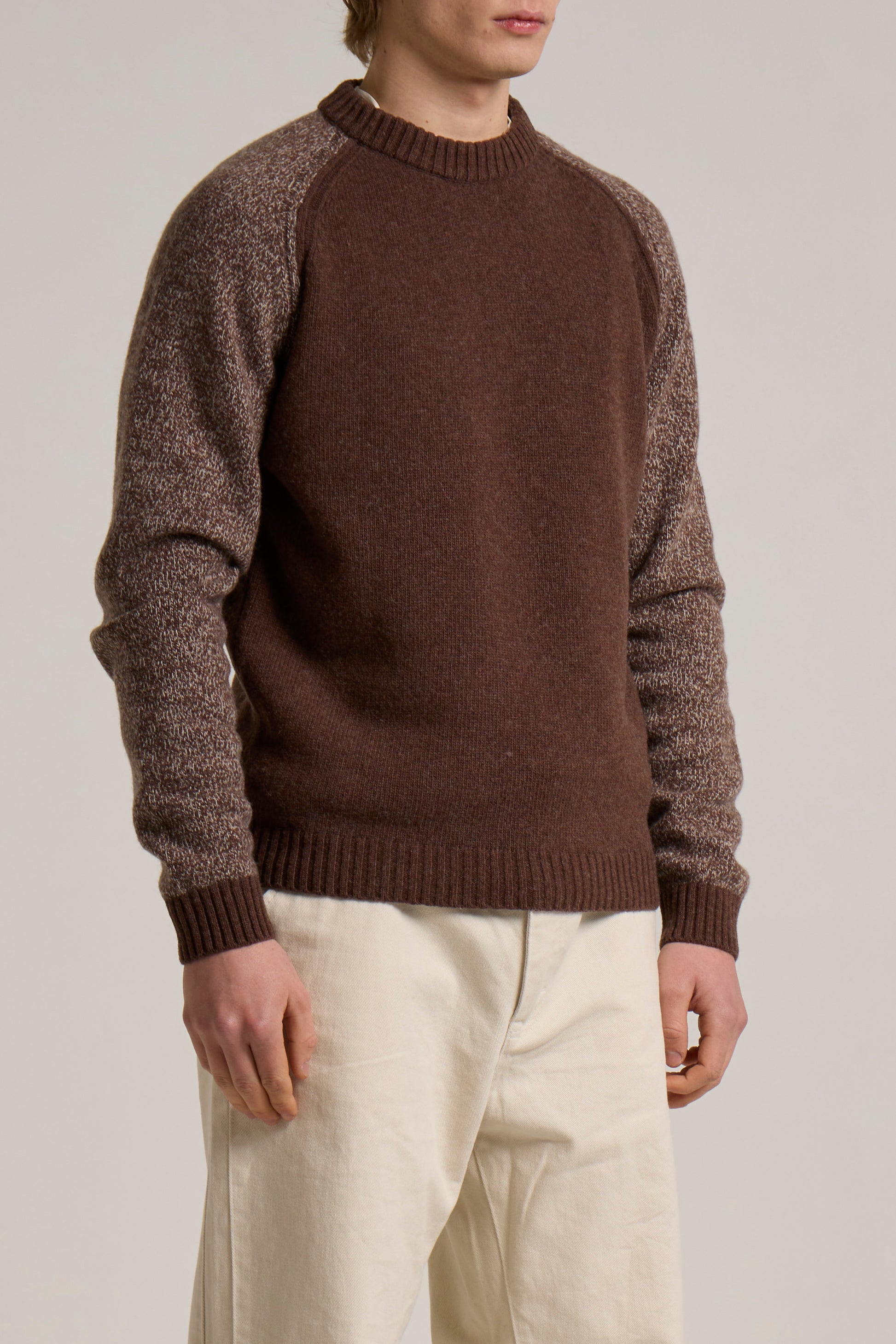 Lambswool yarn, Moulinè sleeves and solid coloured front and back crew neck sweater with raglan armhole and 2x1 finishing.