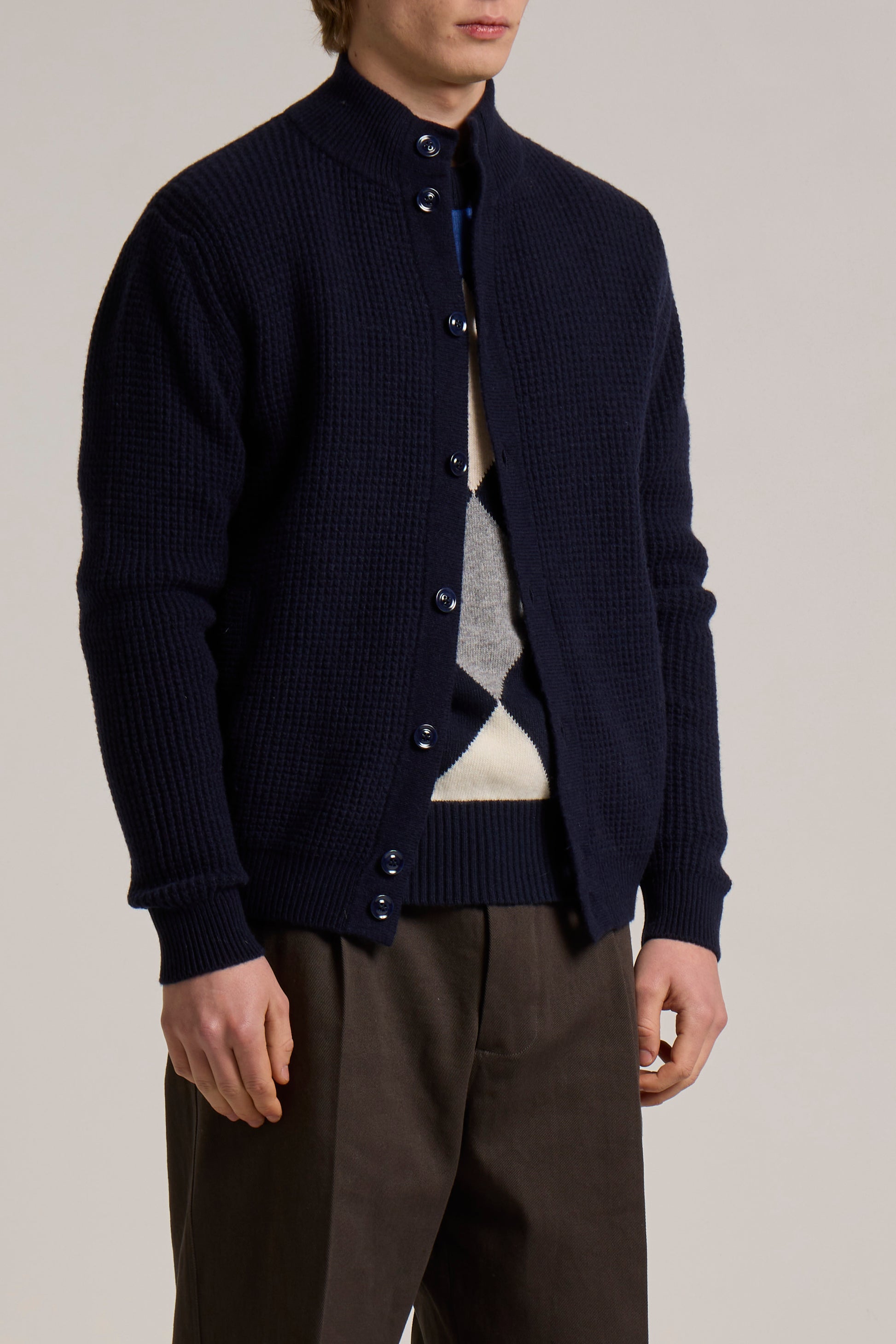 Yarn dyed Lambswool, fully fashion fisherman ribs stitch knitted jacket, with tone on tone buttons, 1 x 1 rib bed finishing and side pockets.