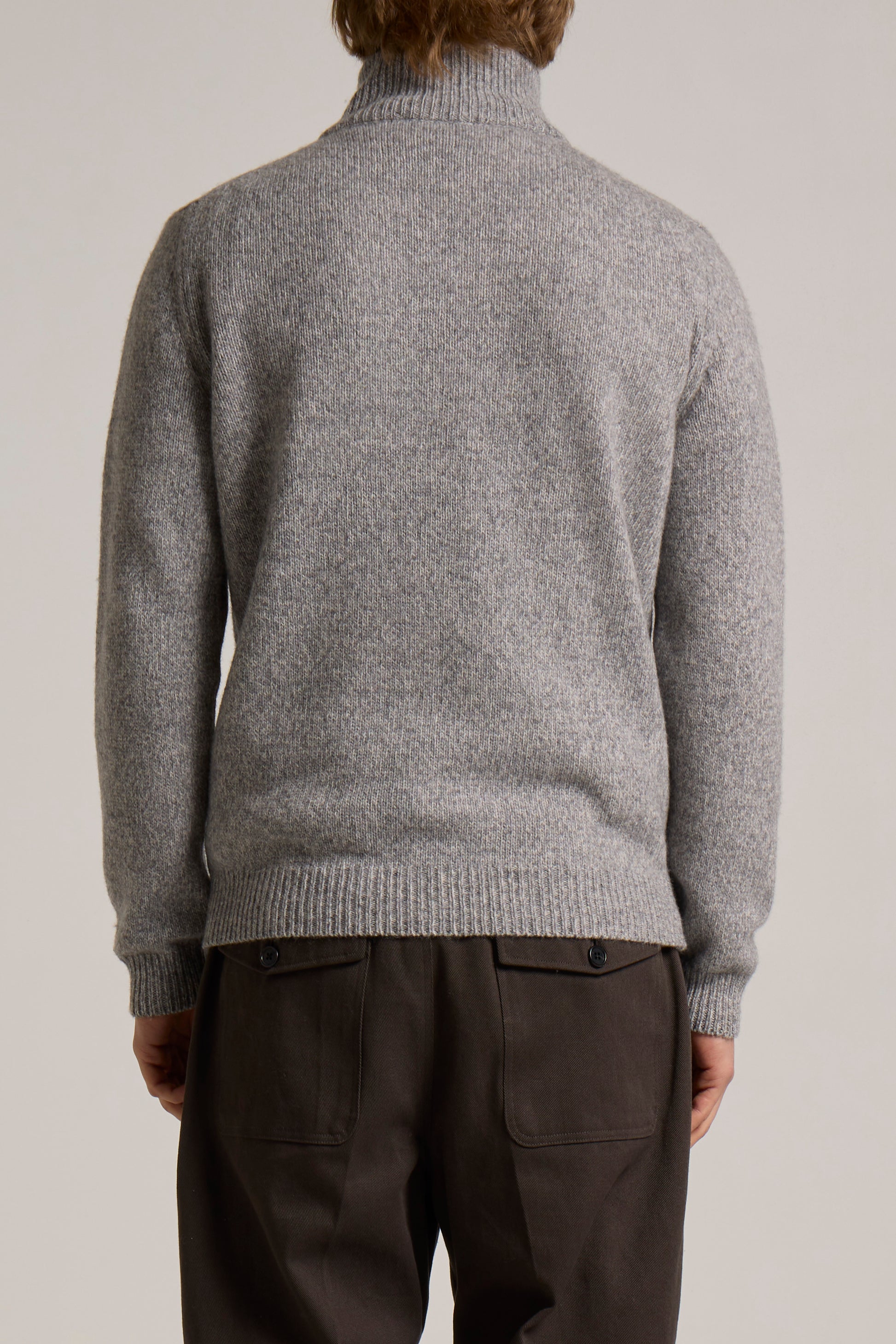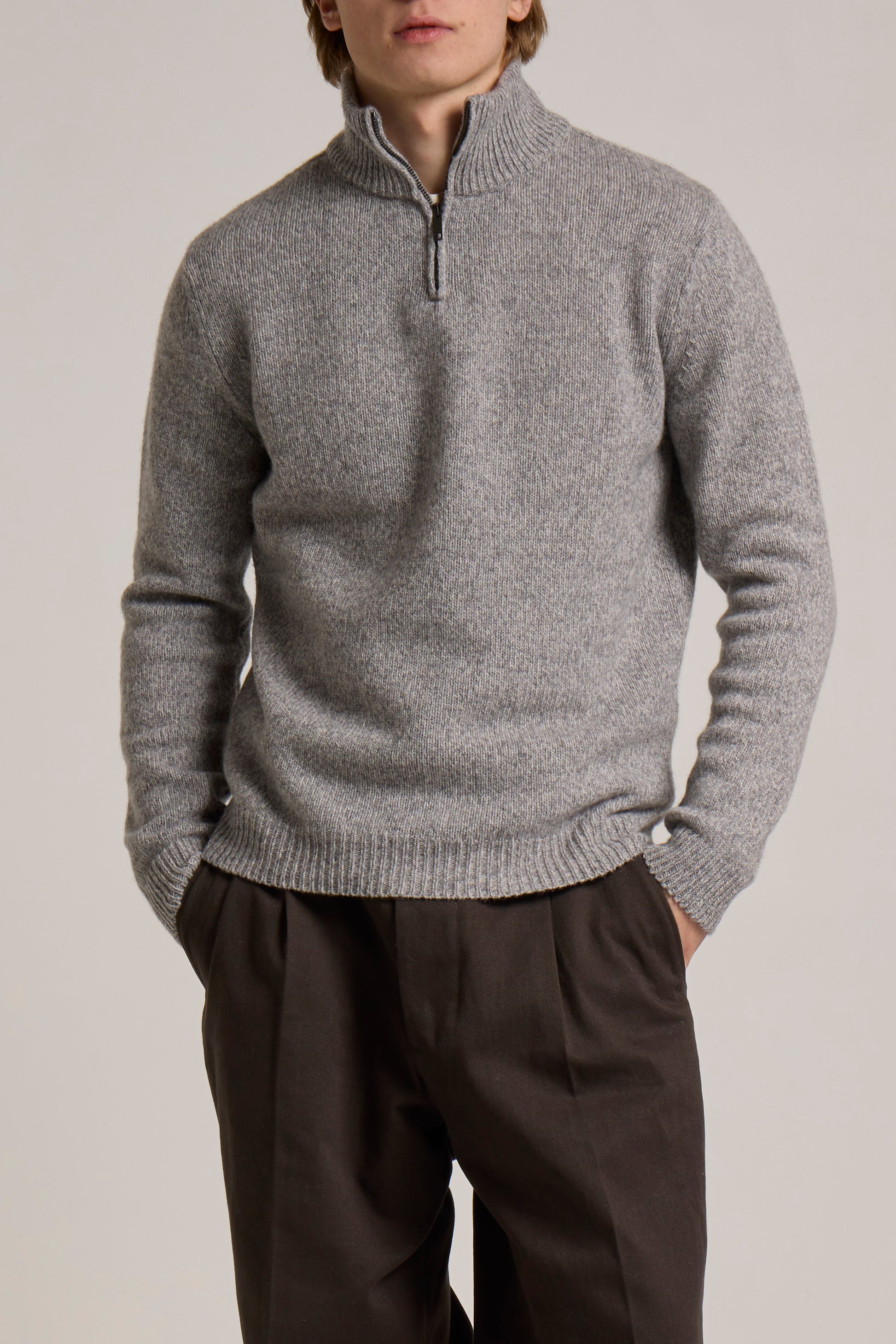 Middle weight, Lambswool Moulinè yarn, single jersey zipped half neck sweater with 1x1 finishing.