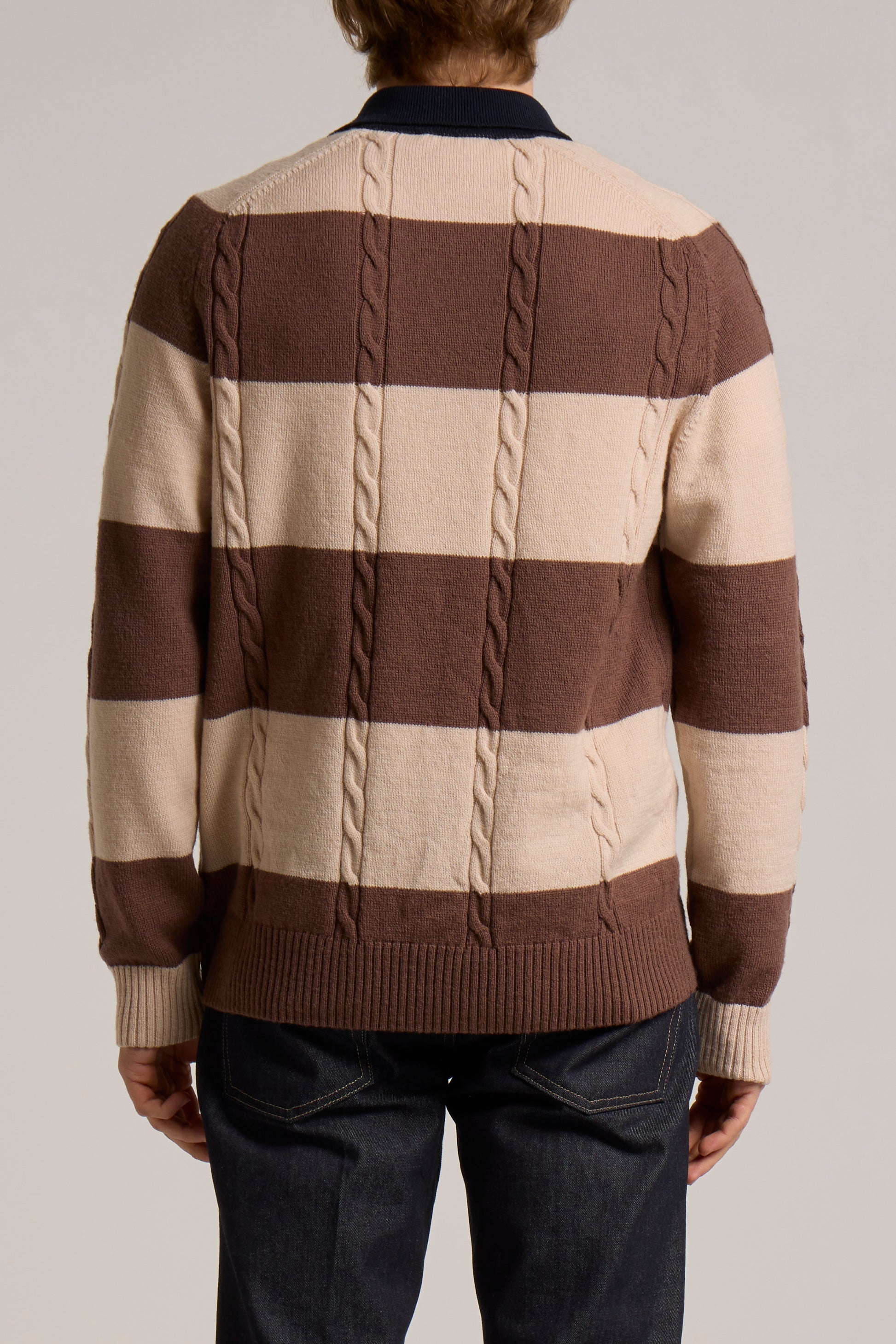 Extra twisted Merino's Wool, middle weight rugby striped on wide ribs and cables, 2 tone on tone buttons polo neck sweater with 2x1 finishing.