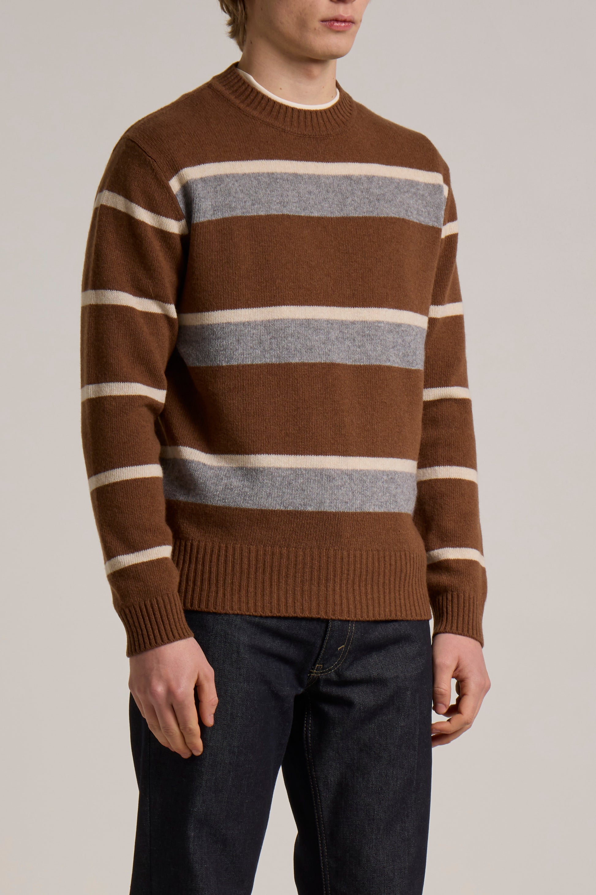 100% “Soft Shetland” Wool, middle weight 3 coloured striped crew neck sweater with 2x1 finishing.